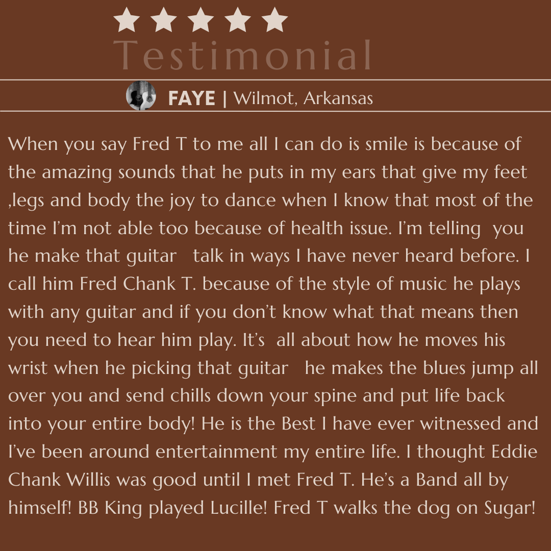 Fred T and The Band doesn’t need to convince anyone that they are the band to see live and work with. The live performances and reviews speak for themselves. See few of many reviews below from people who have witnessed Fred T and the Band in action.